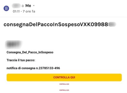 “Vi arriverà un messaggio con il seguente testo: “Il tuo pacco è stato trattenuto presso il nostro centro di spedizione. Si prega di seguire le istruzioni qui” con il link da cliccare.