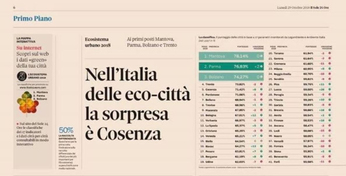 Il Sole 24 Ore: Performance ambientali e vivibilità , “La sorpresa è Cosenza” Ottobre 29,12:00 AM By Redazione In News