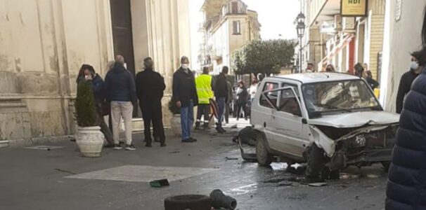“Per cause ancora in corso di accertamento, una anziana alla guida di una Fiat Panda di colore bianco, dopo aver percorso diversi metri ad alta velocitร in pieno centro, si รจ schiantata contro il palo del divieto di accesso, andando contromano e investendo un anziano che versa in condizioni serie.”