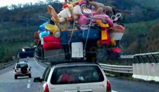 “Portapacchi stracolmo di bagagli e giocattoli”