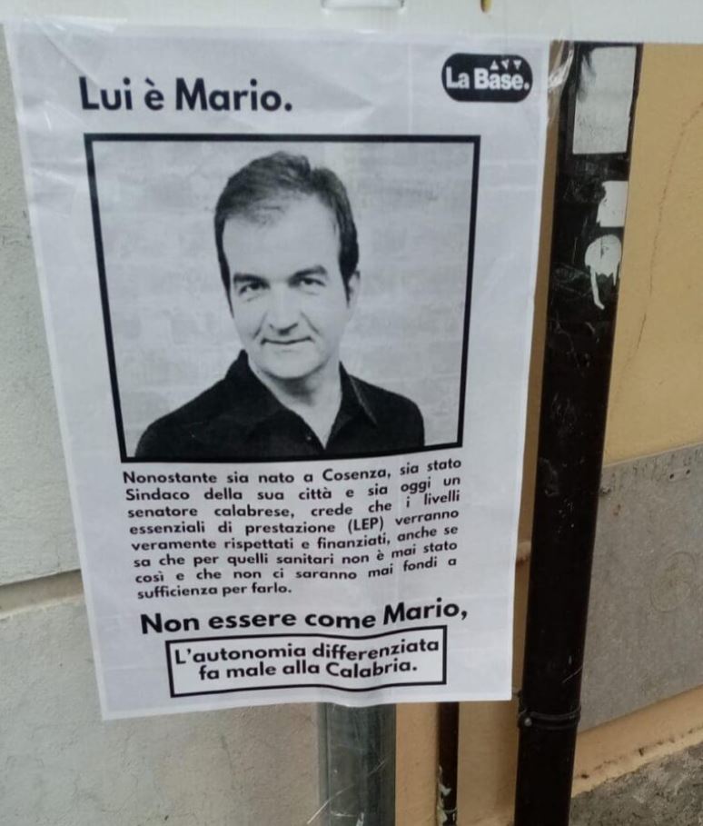 “«Pubblicare i manifesti di noi parlamentari che abbiamo votato l’autonomia differenziata non è un atto politico ma è un atto di violenza che ricorda i movimenti terroristici rossi degli anni settanta.» Questa la nota del senatore di Forza Italia Mario Occhiuto che commenta la pubblicazione di alcuni manifesti apparsi a Cosenza.”