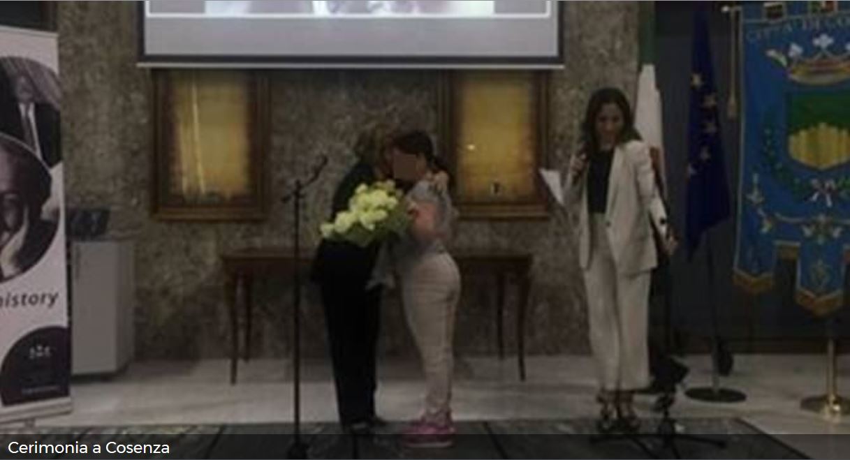 Il momento della consegna di un mazzo di fiori alla presidente del tribunale Maria Luisa Mingrone da parte della 14enne disabile di Amantea, esclusa nei giorni scorsi dal viaggio di istruzione proprio a Palermo, a cui hanno invece partecipato tutti i suoi compagni di classe: