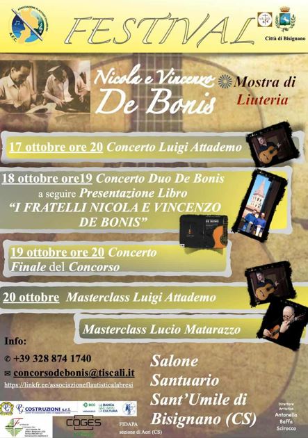 Il Festival Nicola e Vincenzo De Bonis unisce formazione, spettacolo e valorizzazione del patrimonio culturale calabrese. Concerti, concorsi, masterclass, recital e mostre si trasformano in occasioni di incontro, crescita e condivisione, in un percorso che intreccia conoscenza musicale e tradizione liutaria, consolidando la Calabria come protagonista sulla scena internazionale della chitarra classica.