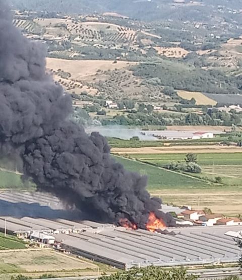 In fiamme alcuni capannoni. Sul posto i vigili del fuoco con l’ausilio di un mezzo aereo per lo spegnimento.