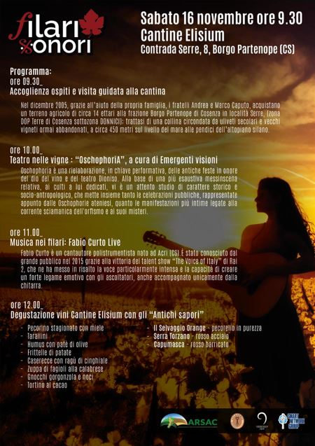 Sabato 16 novembre 2024, alle ore 9.30, le Cantine Elisium di Contrada Serre, Borgo Partenope (CS), ospiteranno un evento unico nel suo genere: “Filari Sonori”, un’esperienza che unisce arte, cultura e tradizione calabrese, immersa nella suggestiva cornice dei vigneti e degli uliveti secolari