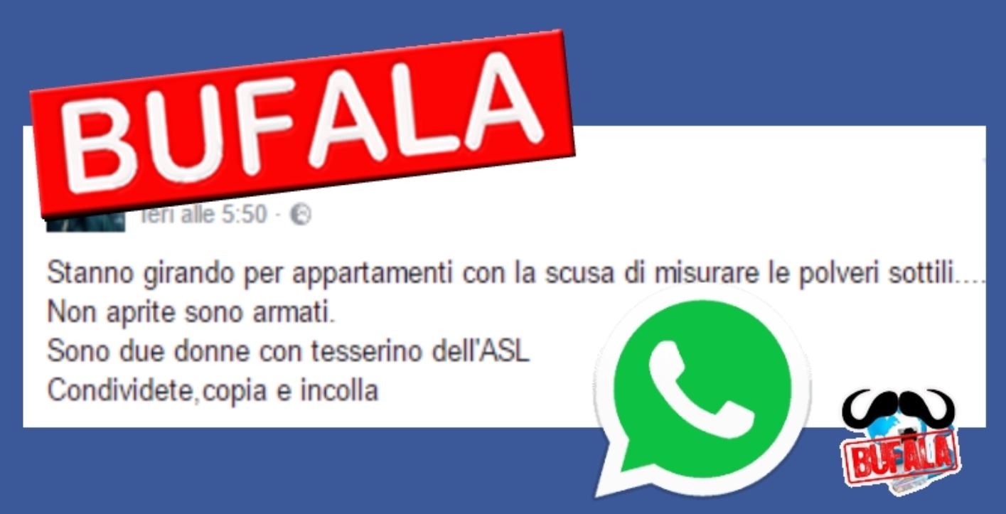 “Stanno girando per appartamenti con la scusa di misurare le polveri sottili….. Non aprite sono armati. Sono due donne con tesserino dell’ASL. Condividete, copia e incolla massima diffusione.”