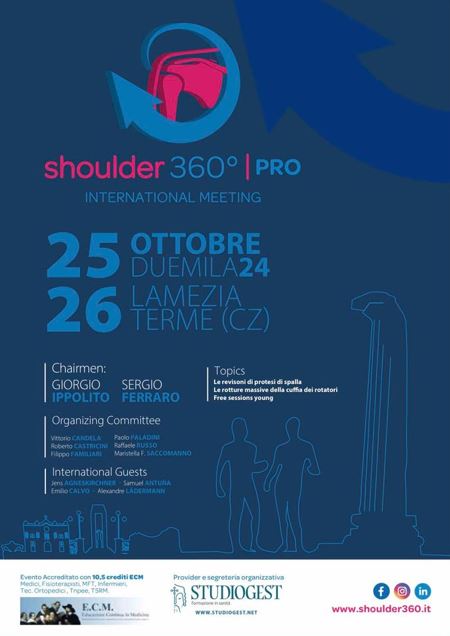 L’evento, sempre organizzato dai dottori calabresi Giorgio Ippolito e Sergio Ferraro, entrambi chirurghi della spalla, che operano rispettivamente a Latina e a Sanremo, avrà luogo il 25 e 26 Ottobre a Lamezia Terme presso il THotel.