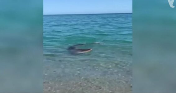 Un video ritrae l’animale (in apparente difficoltà) a pochi metri dalla riva