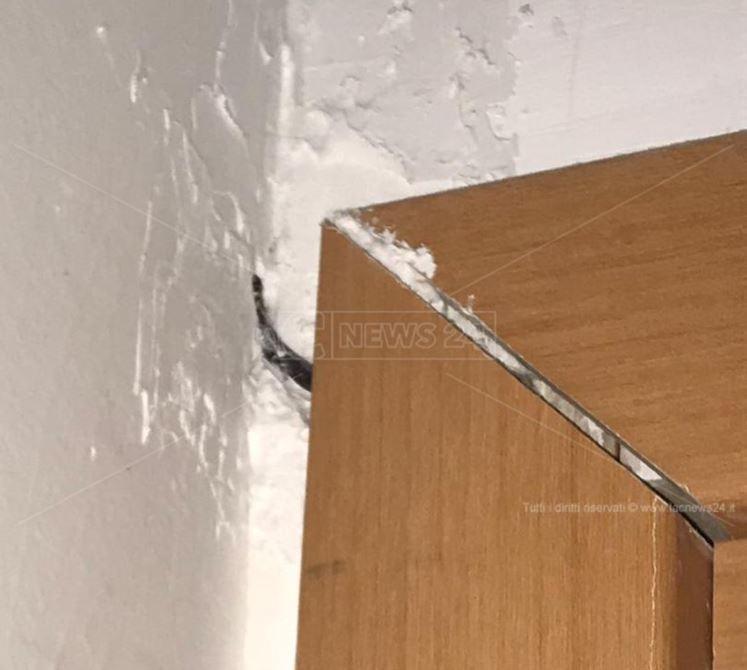 “È stata ritrovata nei giorni scorsi nascosta all’interno dello stipite di una porta dei servizi igienici riservati alle donne… piazzata nel telaio della porta del bagno dal quale si nota inoltre spuntare un cavo elettrico incassato nel muro e coperto da intonaco.”