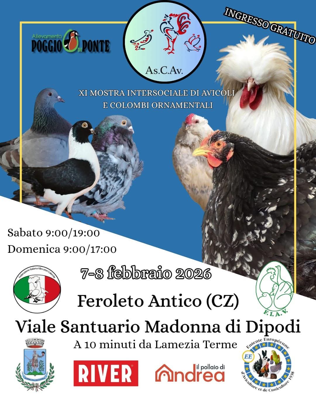 “Siete pronti per un weekend alla scoperta del mondo avicolo e colombofilo? L’associazione ASCAV è entusiasta di invitarvi alla XI° Mostra Intersociale a giudizio di Avicoli e Colombi ornamentali, che si terrà il 7 e 8 febbraio 2026 a Feroleto Antico – 10 minuti Lamezia Terme!