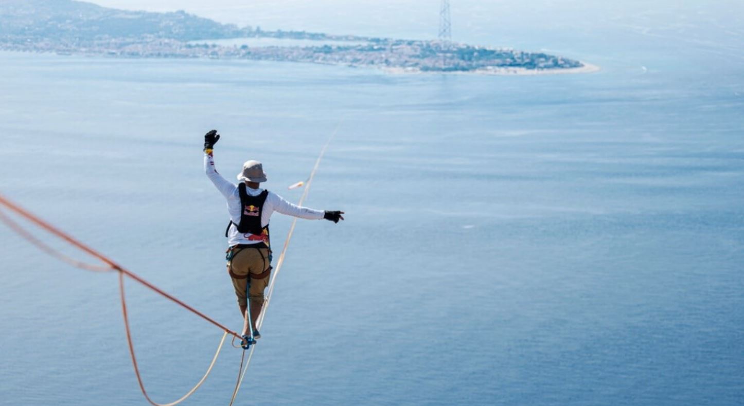“L’atleta Red Bull Jaan Roose questa mattina è giunto al Pilone di Messina dopo essere partito dal pilone a Villa San Giovanni, imbragato a 250 metri di altezza, alla volta di un’impresa mai tentata prima: la Messina Crossing, ovvero attraversare i 3.600 metri dello Stretto di Messina su un nastro di 1,9 centimetri di larghezza.”
