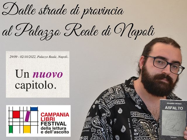 «Il mio libro “Asfalto” è stato selezionato per il “Campania libri festival” che si terrà nella splendida cornice del “Palazzo Reale” di Napoli, in pieno Centro, tra la storica “Piazza del Plebiscito”, la “Via Toledo” e il celebre “Bar Gambrinus”, dal 29 Settembre al 2 Ottobre 2022.