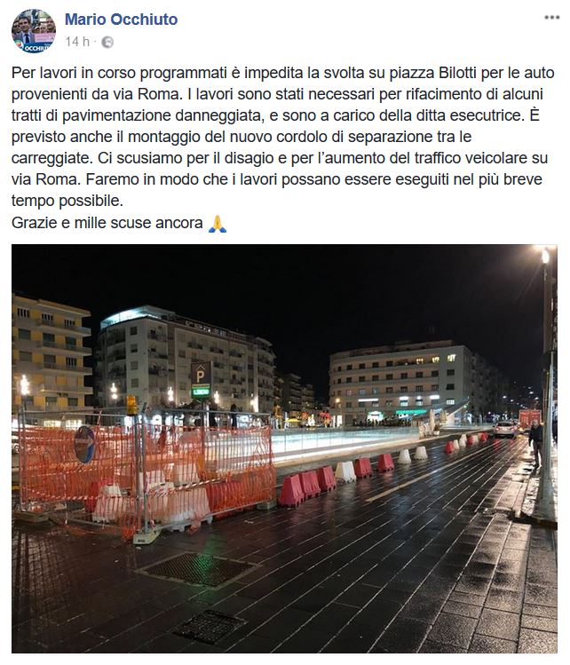 “Per lavori in corso programmati è impedita la svolta su piazza Bilotti per le auto provenienti da via Roma. I lavori sono stati necessari per rifacimento di alcuni tratti di pavimentazione danneggiata, e sono a carico della ditta esecutrice.