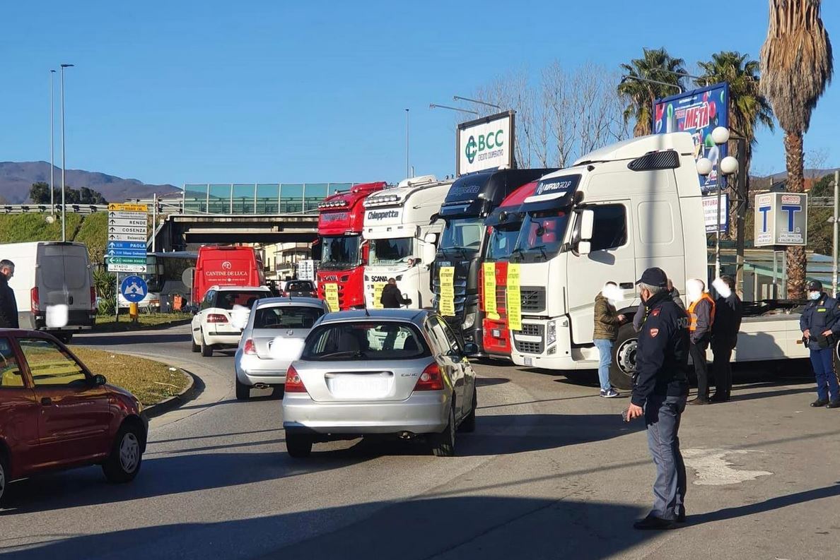 “Infiamma la protesta contro il caro carburanti. Sull’autostrada “A2”, nei pressi dello svincolo di Rende, diversi camion sono parcheggiati causa disagio inferto al comparto dalla recente impennata dei prezzi del carburante legata anche al conflitto russo-ucraino.”