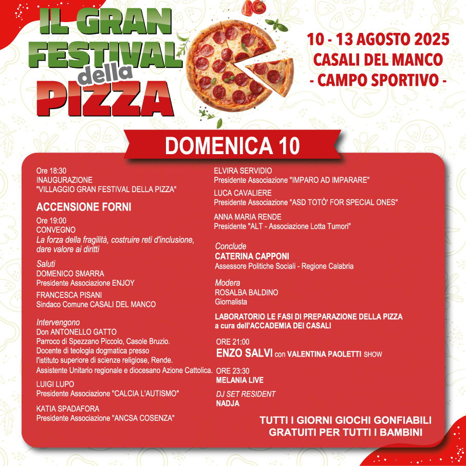 Questa terza edizione punta anche a rafforzare il ruolo strategico dell’evento nella promozione del territorio. I sindaci del comprensorio di Casali del Manco e rappresentanti istituzionali della Regione Calabria hanno sostenuto la manifestazione come occasione di valorizzazione delle risorse locali, stimolo al turismo e leva per la crescita dell’economia silana. Il Gran Festival della Pizza di Casali del Manco si conferma così piattaforma di cultura, gusto e inclusione, capace di parlare a tutti e di valorizzare un patrimonio che unisce, accoglie e fa festa.