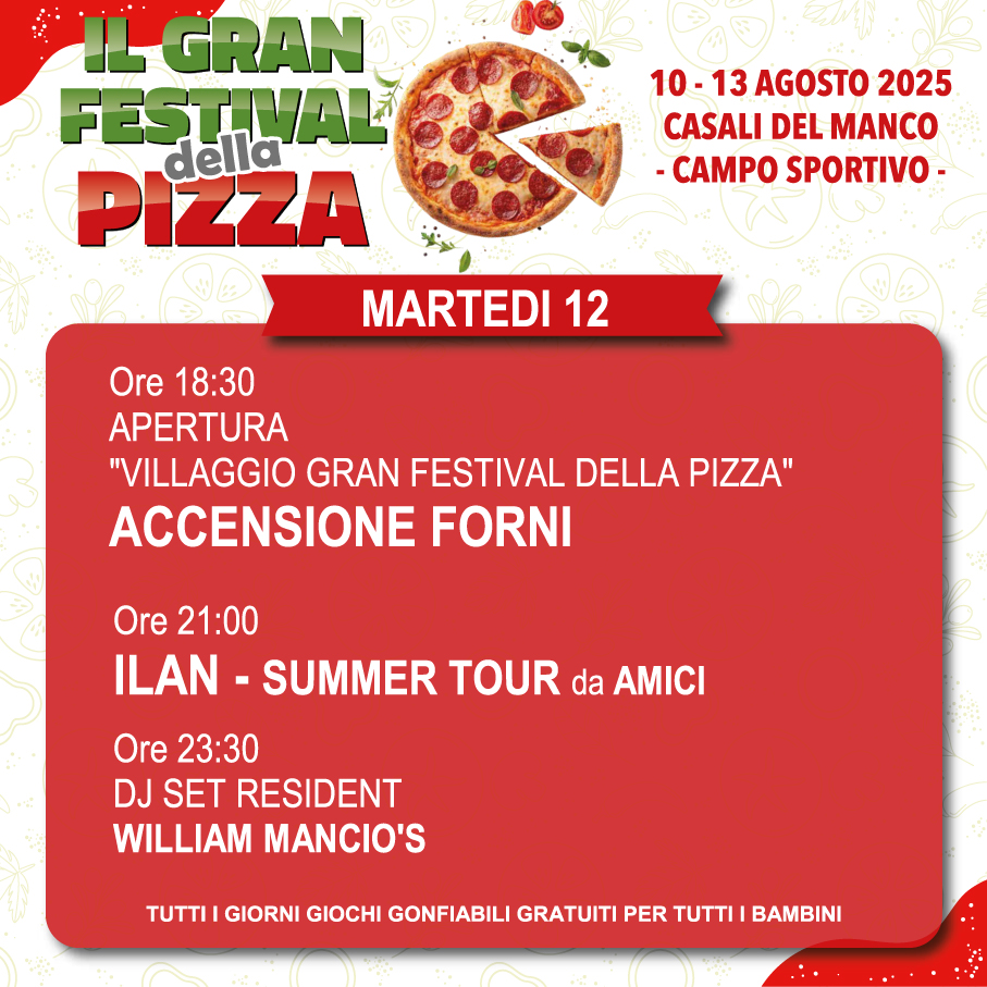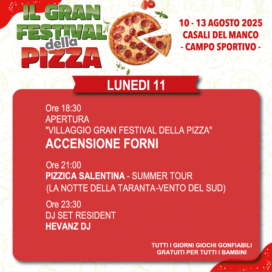 Tutto pronto per la terza edizione del Gran Festival della Pizza, in programma dal 10 al 13 agosto 2025 nel Campo Sportivo di Spezzano Piccolo, del comune di Casali del Manco