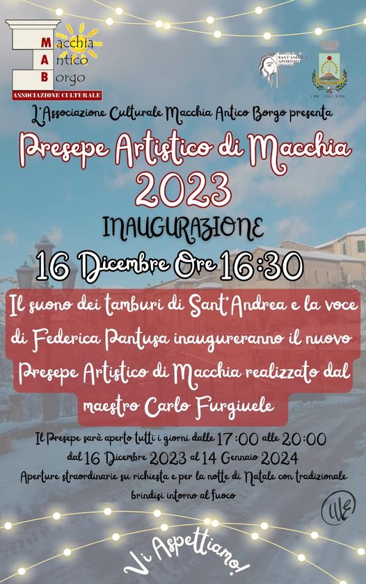 L’associazione Culturale Macchia Antico Borgo presenta il Presepe Artistico 2023 Dicembre 27,12:00 AM By Redazione In EVENTI|News