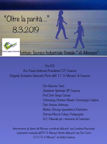 Incontro “Oltre la parità…” – Il CIF, Centro Italiano Femminile, dai ragazzi dell’ITIS “A.Monaco” di Cosenza Marzo 10,12:00 AM By Redazione In EVENTI|News