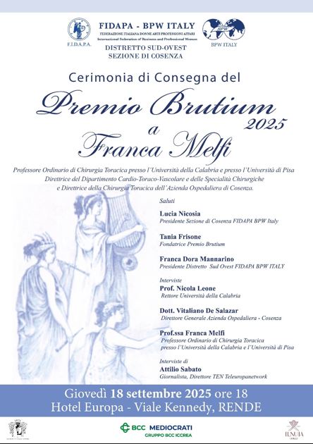 Fidapa – Cerimonia di consegna del Premio Brutium 2025 a Franca Melfi Settembre 16,12:00 AM By Redazione In EVENTI|News,Società,