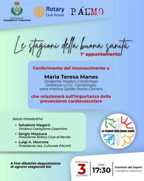 Oggi a Castiglione Cosentino prende il via il progetto “Le stagioni di una buona sanita” Dicembre 3,12:00 AM By Redazione In EVENTI|News,Società,