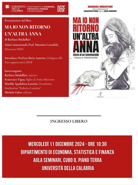 Unical – Presentazione del libro “Ma io non ritorno – Un’altra Anna” di Barbara Modaffari Dicembre 10,12:00 AM By Redazione In EVENTI|News,Società,