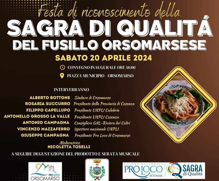 A Orsomarso la “Festa di riconoscimento della Sagra di Qualità del fusillo orsomarsese” Aprile 19,12:00 AM By Redazione In EVENTI|News,Società,