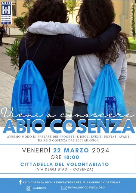 “ABIO Cosenza Odv” – Associazione per il Bambino in Ospedale cerca nuovi volontari Marzo 19,12:00 AM By Redazione In EVENTI|News,Società,