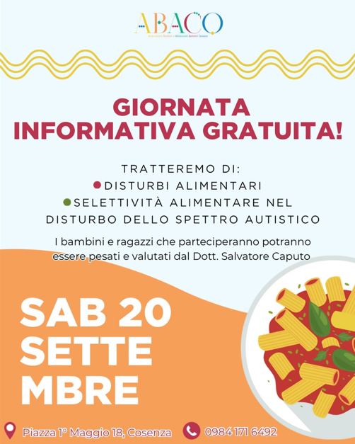 Abaco – A Cosenza giornata informativa gratuita sui disturbi alimentari Settembre 19,12:00 AM By Redazione In EVENTI|News,Società,