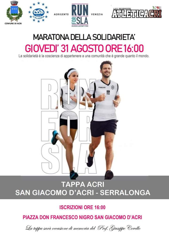 Domani anche ad Acri la maratona della solidarietà “Run for SLA” Agosto 30,12:00 AM By Redazione In EVENTI|News,Società|News,Sport,