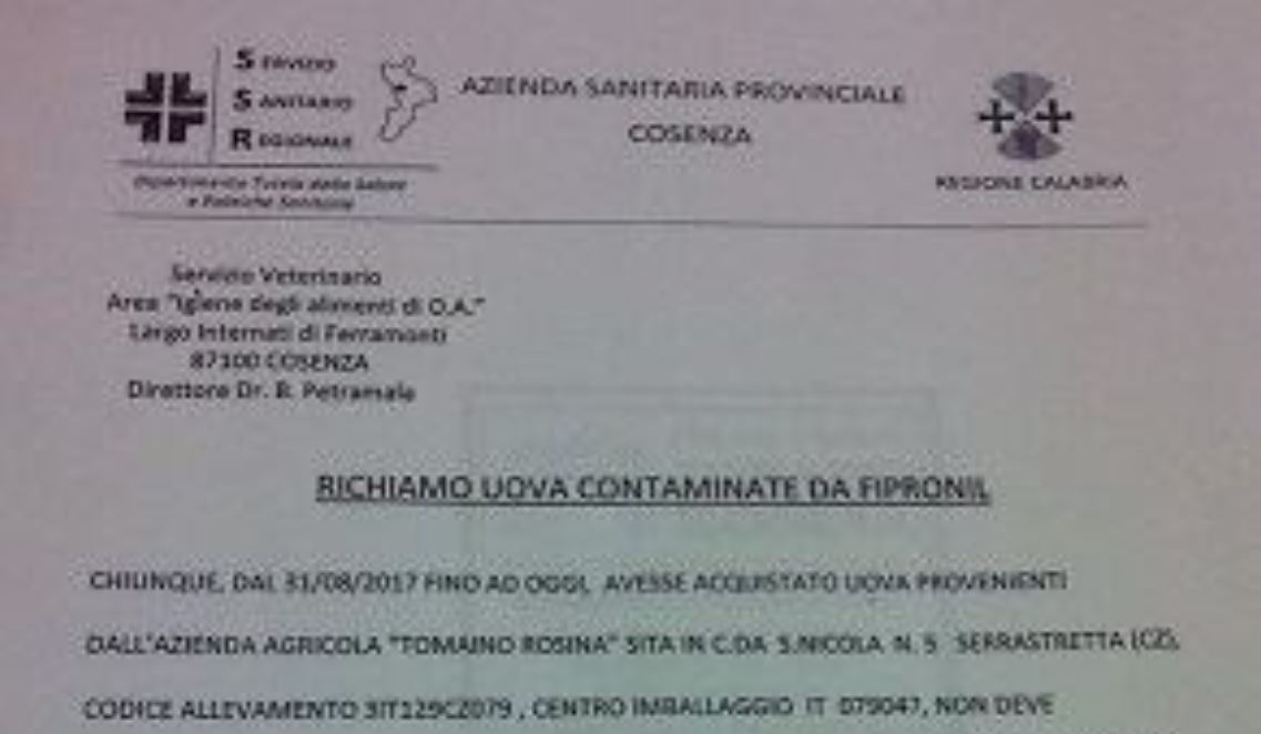 Allarme Fipronil. Asp di Cosenza emana richiamo uova contaminate Settembre 22,12:00 AM By Redazione In News