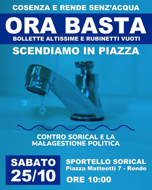 “ORA BASTA – Bollette altissime e rubinetti vuoti” – Domani manifestazione alla Sorical Ottobre 24,12:00 AM By Redazione In News,Società,