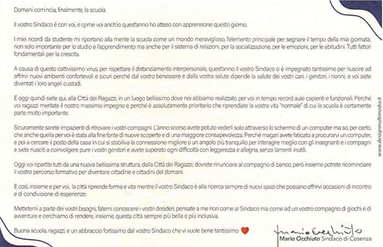 Lettera al sindaco di Rende: “Con la chiusura delle scuole i bambini pagano gli errori degli adulti” Novembre 10,12:00 AM By Redazione In News,Società,