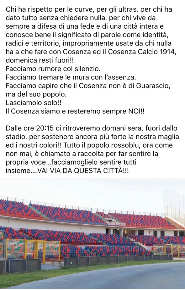 Le tifoserie del Cosenza questa sera si raduneranno in protesta fuori dallo stadio Agosto 31,12:00 AM By Redazione In News,Società |News,Sport,
