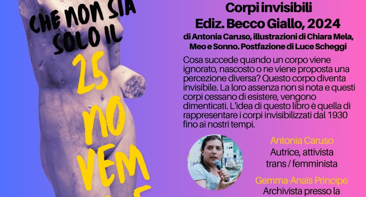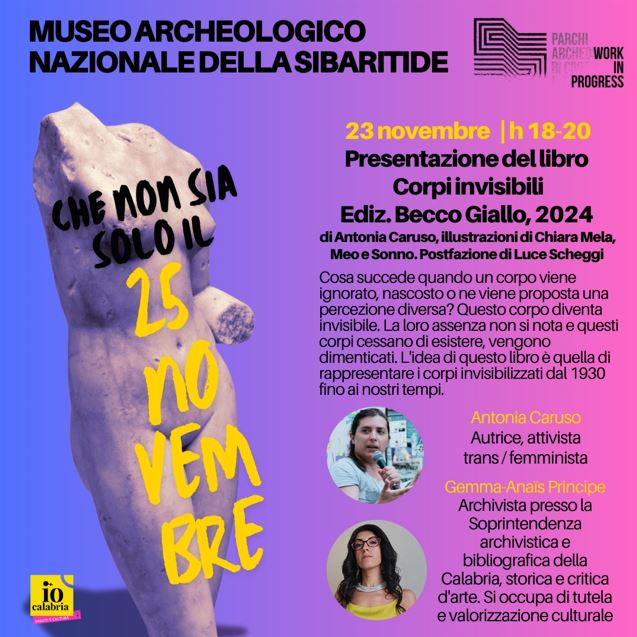 23 novembre ore 18_ Presentazione del libro Corpi invisibili. Ediz. Becco Giallo, 2024 di Antonia Caruso (Autore) , Michela Rossi (Illustratore) , Chiara Melchionna (Illustratore), dialoga con l’autrice Gemma-Anaïs Principe, Archivista presso la Soprintendenza archivistica e bibliografica della Calabria, storica e critica d’arte. Si occupa di tutela e valorizzazione culturale. Cosa succede quando un corpo viene ignorato, nascosto o ne viene proposta una percezione diversa? Questo corpo diventa invisibile. C’è chi non deve pensare al proprio corpo, quando è in pubblico, perché conforme, adatto, “normale”; e ci sono corpi invece che vengono (e sono sempre stati) tenuti fuori dalla sfera pubblica, dai luoghi fisici, dalle narrazioni. La loro assenza non si nota, anzi, al contrario turba la loro presenza perciò “lontano dagli occhi, lontano dal cuore” e questi corpi cessano di esistere, vengono dimenticati. L’idea di questo libro è quella di rappresentare i corpi invisibilizzati dal 1930 fino ai nostri tempi.