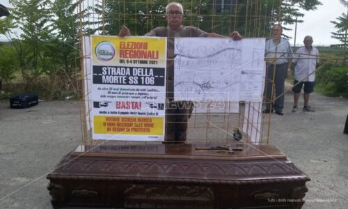 “Il presidente del comitato Vita (viabilità infrastrutture trasporti ambiente), Nando Amoruso, si è posizionato all’interno di una gabbia in ferro ai bordi della strada, nel tratto tra Torre Melissa e Cirò Marina, per richiamare l’attenzione della politica e delle istituzioni su un’arteria «dimenticata e sulla quale sono state fatte solo promesse per 50 anni».”