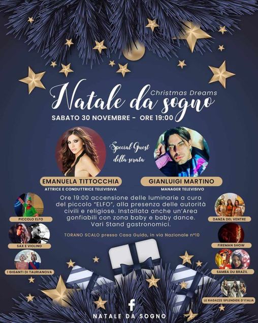 L’evento si aprirà ufficialmente sabato 30 novembre alle ore 19:00, con una serata speciale che darà il via al Natale. Protagonista dell’inaugurazione sarà l’accensione delle luminarie natalizie, guidata dal nostro piccolo “Elfo” e accompagnata dalle autorità locali. La serata sarà arricchita dalla presenza speciale di Emanuela Tittocchia, attrice e conduttrice televisiva, e Gianluigi Martino, manager televisivo.