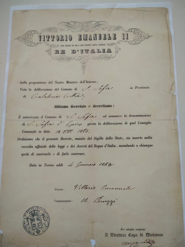 Il decreto datato 4 gennaio 1863 e firmato dal Re Vittorio Emanuele, nel leggerlo, ancora una volta prova che l’orgoglio di noi Sofioti ha avuto ragione di esistere.