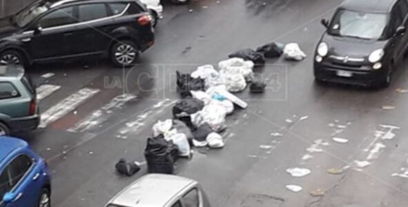 “A Cosenza, in via Panebianco, alcuni cittadini del posto hanno gettato in mezzo alla carreggiata parte dei cumuli di rifiuti ormai da diversi giorni non ritirati a causa delle note difficoltà”