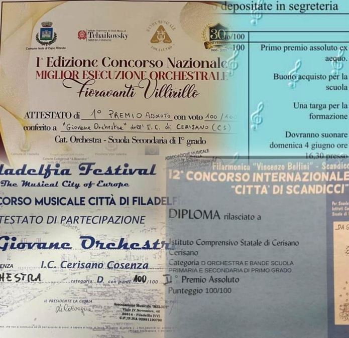 “La Giovane Orchestra IC Cerisano si è aggiudicata il podio della classifica, con la seguente votazione 100/100, hanno vinto quattro concorsi su quattro, sempre con il massimo del punteggio.