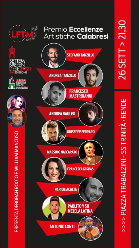 Dopo il grande successo degli eventi dei giorni scorsi (uno su tutti il concerto di Joe Bastianich e La terza classe che ha letteralmente entusiasmato il pubblico presente al concerto nel centro storico), tutta l’attenzione è adesso rivolta al premio alle eccellenze artistiche calabresi, previsto per il 26 settembre al palco allestito a piazza Trabalzini dove a partire dalle 21,30 si alterneranno diversi artisti presentati da Deborah Rocco e William Mancuso.