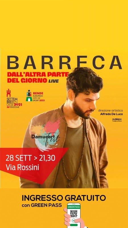 Il giorno dopo, stessa location e stesso orario, spazio al talento emergente di Domenico Barreca e al suo tour “Dall’altra parte del giorno” nel quale il giovane artista propone in versione live i brani inediti usciti nell’album che dà il titolo al tour e che è uscito lo scorso 19 gennaio. Domenico, però, non sarà solo: nel corso della serata, si esibiranno infatti oltre 53 artisti provenienti da tutta la regione che prenderanno parte al “Damucart Fest” (tra gli Special guest l’attore Gianni Pellegrino alias Re Peperoncino).