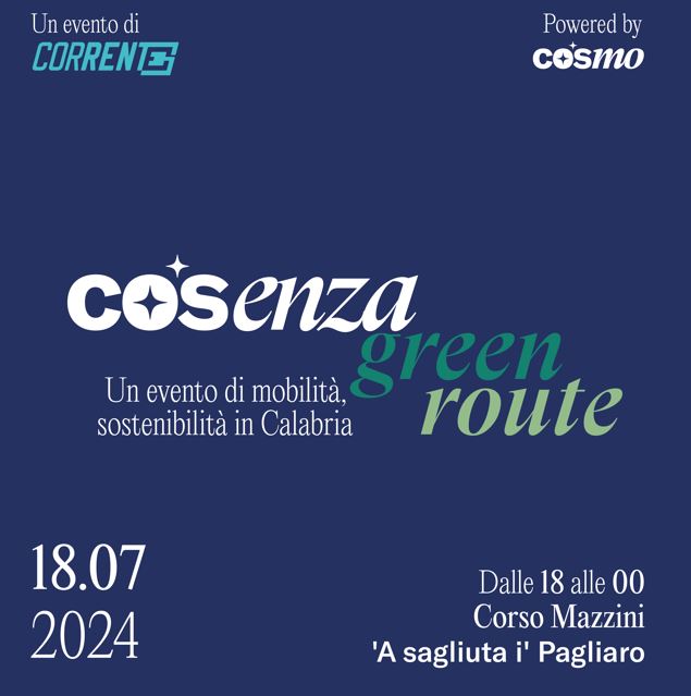 Cosenza Green Route è un evento, ad ingresso gratuito, che permetterà ai partecipanti di conoscere e interagire con le tematiche di mobilità sostenibile oltre che conoscere più da vicino il nuovo servizio di Corrente. Durante l’evento sarà possibile fruire dell’esperienza interattiva “Green Route”: un videogioco che permetterà agli utenti di esplorare e comprendere le emissioni di Co2 delle auto attraverso la visualizzazione dei dati.