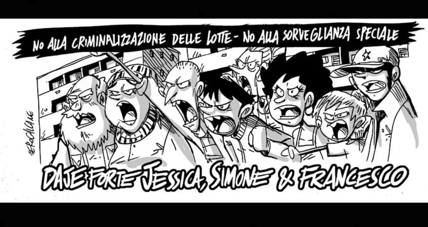 “Cresce la mobilitazione per gli attivisti cosentini destinatari di una richiesta di sorveglianza speciale da parte della Questura. Anche ZeroCalcare, utilizzando la sua arte, si schiera al loro fianco (foto), «al fianco della parte sana della città, contro la criminalizzazione delle lotte sociali e le proposte di sorveglianza speciale»”