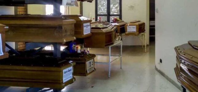“Il problema della carenza di loculi non è stato risolto del tutto. E così da settimane è cresciuto il numero di bare depositate nelle sale alla sinistra dell’ingresso principale di colle Mussano. Alcune sulle tavole in legno hanno il manifesto funebre, altre, quelle più vecchie, soltanto il nome della persona scomparsa e la data.”