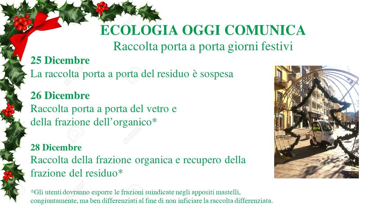 “L’Amministrazione comunale comunica che in ragione del fatto che il giorno di Natale, 25 dicembre, il servizio di raccolta dei rifiuti verrà sospeso, lunedì 24 dicembre non dovrà essere esposta la frazione residuo.