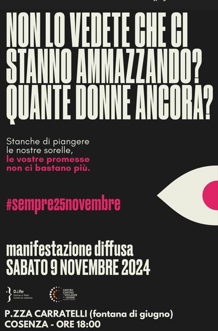 Il prossimo 9 novembre 2024, il Centro Antiviolenza Roberta Lanzino aderisce alla manifestazione nazionale diffusa promossa dalla rete nazionale “D.i.Re – Donne in Rete contro la violenza” con un flash mob contro il femminicidio in Piazza Carratelli (Fontana di Giugno) alle ore 18:00.