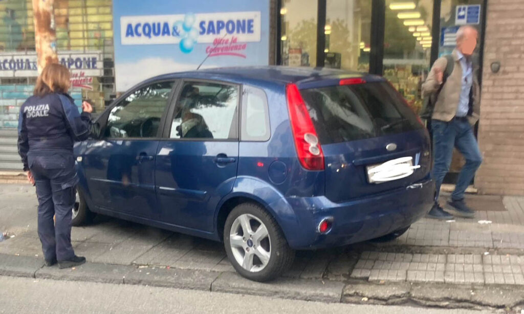 Questa mattina, su Via Roma a Cosenza, il conducente di una vecchia Ford Fiesta ha optato per una sosta decisamente fuori dal comune, parcheggiando l’auto sul marciapiede di fronte all’ingresso del negozio “Acqua e Sapone”