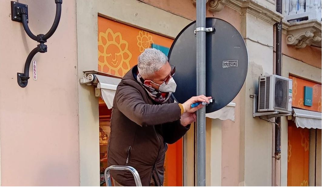 Il consigliere comunale di Cosenza, Massimiliano D’Antonio, con pinza e scala prestate dai negozianti della zona, ha riparato un segnale stradale pericolante