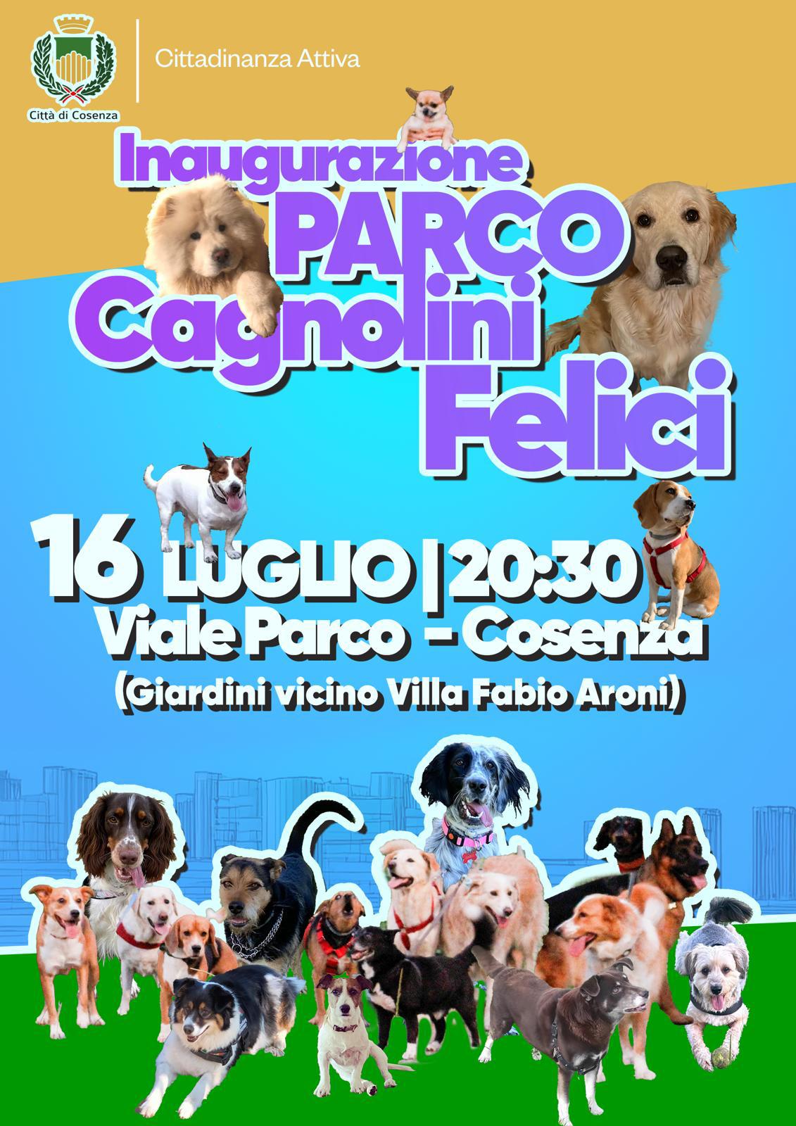 Sarà inaugurato mercoledì prossimo 16 luglio, alle ore 20.30, il Parco “Cagnolini felici”.  Il nuovo sgambatoio per gli amici a 4 zampe è ubicato all’interno dei giardini “Fabio Aroni”, situati lungo Viale Giacomo Mancini. La struttura è stata realizzata a seguito dell’approvazione, da parte della Giunta e del Consiglio Comunale, del Regolamento che prevede espressamente la sottoscrizione dei patti di collaborazione, tra cittadini e Amministrazione Comunale, per la cura, la rigenerazione e la gestione condivisa dei beni comuni urbani.