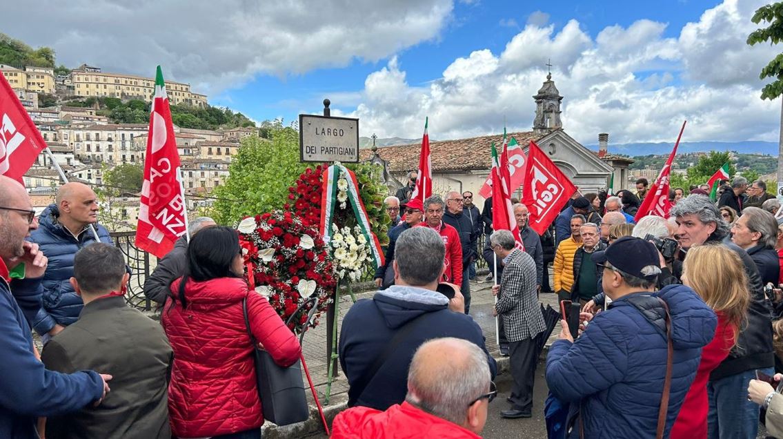 “Deposta da parte della Cgil e da una lunga schiera di associazioni antifasciste una corona di fiori a Largo dei Partigiani, lo spiazzo che dalla Galleria Nazionale domina il centro storico di Cosenza. La ricorrenza del 25 aprile ha spinto anche quest’anno attivisti, sindacalisti, comitati cittadini, rappresentanti dell’Anpi ed esponenti dei partiti di centrosinistra a celebrare la Festa della Liberazione in piazza.”